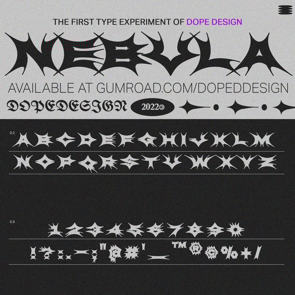 This is the first font created by Dope Design. It is our first experiment with typedesign. It is a display font suitable for 3D chrome plating, we have tried it several times and it lends itself very well to metal materials. Hope you like it!