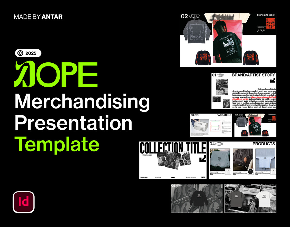 Whether you're a designer, artist, or indie brand, this editable template helps you present your drop with clarity and impact. Built in InDesign and fully customizable, it includes everything you need: from product mockups and lookbook pages to sizing, packaging and storytelling.