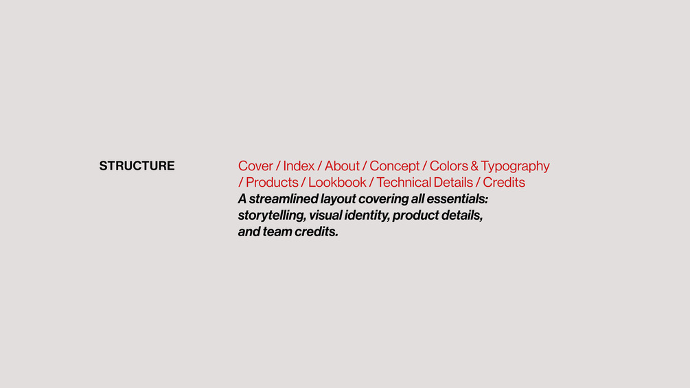 - Structured sections: Cover, Index, Brand Story, Collection Concept, Color & Typography, Products, Lookbook, Technical Info, Credits
